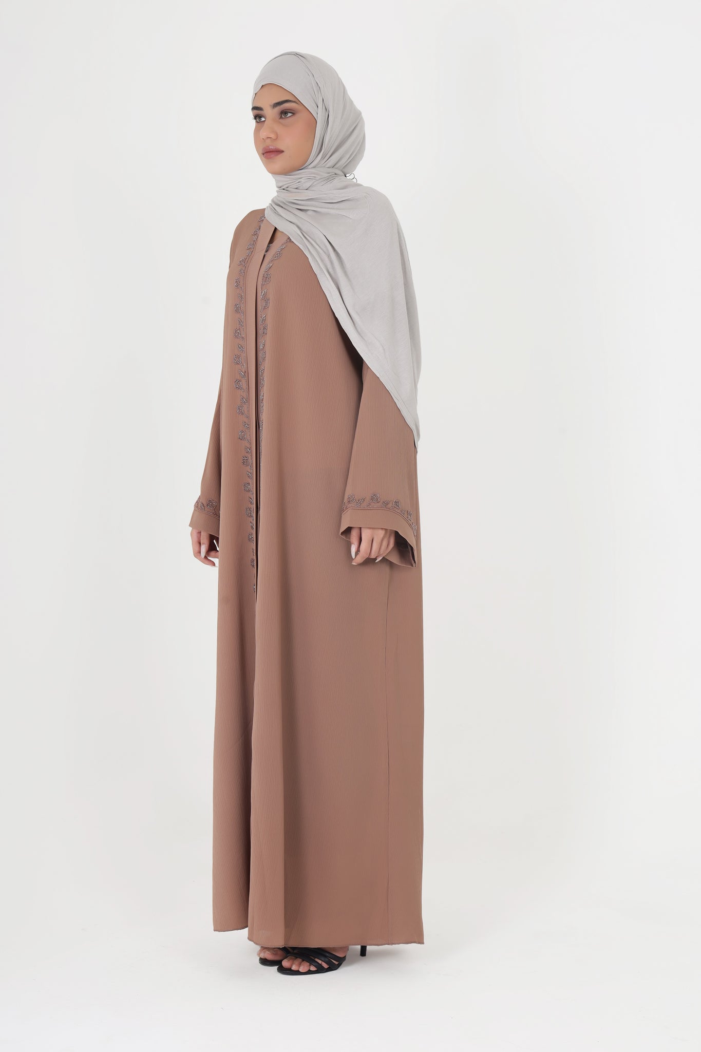 Adorned with exquisite hand embellishments on the cuffs and front side panels, this abaya stands as a testament to intricate artistry.